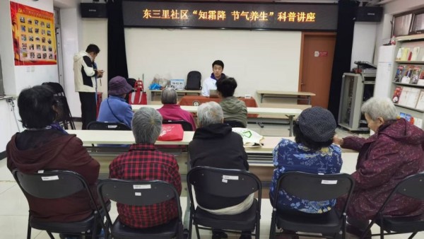 霜降时节,养生正当时。东三里社区特邀京师中医院中医医师开展“知霜降节气养生”科普讲座。医师结合霜降节气特点,围绕“养阴防燥、润肺益胃”的核心养生原则,为居民讲解饮食调理、起居养护要点,现场示范内关穴、足三里穴等保健穴位的正确按摩方法,并提醒居民注意秋季保暖与情绪调节,引导大家树立科学养生理念。活动有效提升了社区居民的健康保健意识,营造出重视健康、科学养生的良好社区氛围。