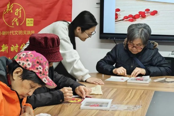活动现场,居民们在专业老师的指导下纷纷化身“大地艺术家”,以图纸板为画布,以白乳胶为媒介,全神贯注地将一粒粒染红的小麦种子精心点缀在画布之上。大家或低头细致涂抹胶水,或小心地用镊子夹取细小的种子,邻里之间不时交流创作心得,互相提供建议。经过一个多小时的精心制作,一幅幅以“福”字为主题的种子画陆续完成。每一幅都因种子选配与粘贴手法的不同而独具个性,由红色种子拼成的“福”字在周围材料的簇拥下,显得饱满而富有生机,凝聚着大家对幸福生活最朴素真挚的祝愿。
