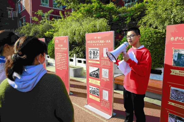 在和平街第一中学高中部操场上,学生们驻足在展板前,学习了解那些承载厚重历史的文物背后的英雄故事,从历史中汲取信仰、智慧和前行的力量。