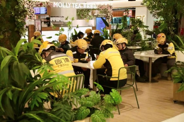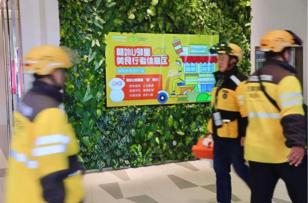 朝外街道悠唐购物中心内,外卖订单络绎不绝。仅美团一个站点日订单量就达3500单,近百名骑手日均在此停留至少15分钟。在商场地下一层的黄金位置,“朝外U邻里美食行者休息区”绿意盎然,成为骑手们忙碌间隙的歇脚处。这个休息区的选址历经多轮筛选优化。最终,商场选择牺牲部分商业经营空间,将其设在餐饮区中心位置。周边聚集着快餐、小食等外卖订单密集的商户,骑手接单后可迅速取餐,等单时也能歇脚充电,真正实现“休息不误接单”的贴心设计。
