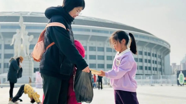 晨跑结束后,一场别开生面的文明接力宣讲随即展开。孩子们围绕"文明观赛、文明观影"主题分享亲身经历,"每次和爸爸在工体看球,都会把垃圾打包带走""看演出时不大声喧哗,才能让大家都享受美好时光",朴实的话语传递着对"人走场净"文明理念的认同。在随后的环境清洁环节,青少年在家长陪伴下手持垃圾袋,细致清理工体周边绿化带内的纸屑、塑料瓶等杂物,以分工协作的实际行动守护城市环境,脸上洋溢着满满的成就感。