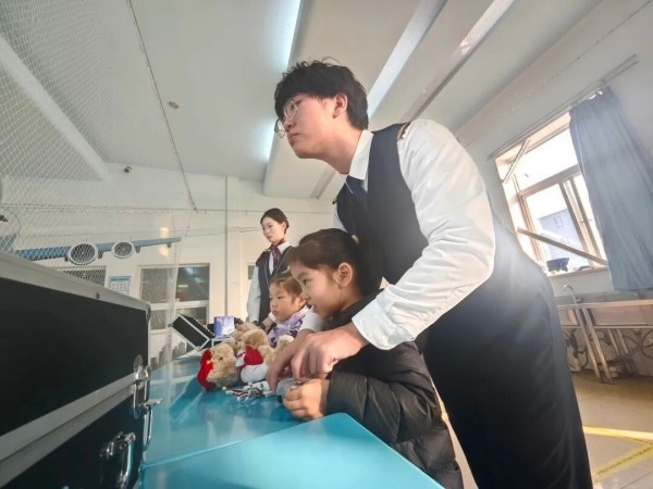 活动现场,求实职业学校的学生们化身“小老师”,为幼儿园孩子们带来了多维度的趣味课堂。在无人机操控室,孩子们手握操控器,尝试操控无人机足球,看着飞行器在空中划出优美弧线,现场欢呼声不断,一颗颗科技探索的种子悄然萌发。飞机设备维修教室里,“小老师”们一边演示工具安全使用规范,一边讲解航空零件的功能作用,严谨的专业态度深深感染着在场孩童。模拟航空教室内,换登机牌、过安检、登模拟飞机等流程依次展开,“小老师”详细演示氧气面罩、救生衣等安全用具的使用方法,让孩子们在沉浸式体验中了解航空知识。