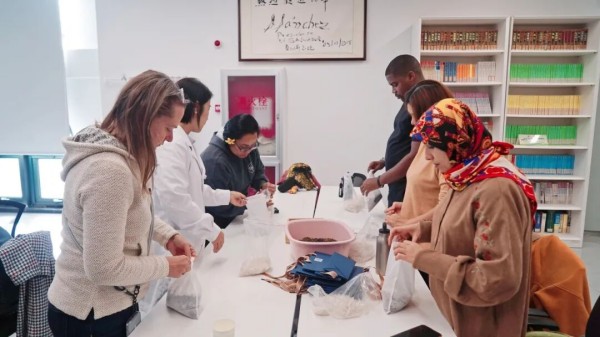 理论讲解结束后,手工制作环节将现场气氛推向高潮。在工作人员的一对一指导下,外籍居民们有条不紊地完成药材筛选、精准称量、混合封装等步骤,亲手将“养生配方”制成专属热庵包。活动现场药香四溢,欢声笑语不断,不同语言的交流与互助,让中医药文化成为跨越国界的“通用语言”。