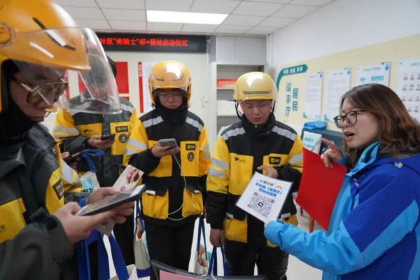 仪式高潮环节,“心驿行动”线上共治平台正式发布,现场工作人员引导外卖员、快递员代表扫码加入“共驻共建沟通群”。据介绍,该平台的上线,搭建起街道、社区与新就业群体的高效沟通桥梁。今后,新就业群体在配送途中发现公共设施损坏、安全隐患、环境卫生问题等社区治理“痛点”,可随时在群内反馈,社区工作人员与居委会成员将第一时间响应处置,让常年奔波的骑士们成为基层治理的“移动探头”和重要力量。