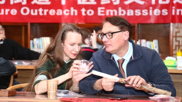 值得一提的是,郝思岚创新性地将书法“永字八法”与中医“阴阳调和”理念相融合,通过理论阐释与实践指导相结合的方式,让使节们在习字过程中领悟中医文化精髓。活动中,郝思岚还为每位嘉宾量身创作嵌名书法作品,以艺术为纽带搭建跨文化交流的桥梁。“这不仅是一门艺术,更是东方智慧的凝结。”德国中医专家马赛丽的感慨道出了现场嘉宾的共同心声。