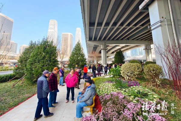 天冷了,桥下又少光,能有绿化景观实属不易。“为了打造绿化景观,我们精选了耐阴、耐寒植物,同时做到层次错落有致。等到了春季,我们还会更换色彩更艳丽的花卉,将桥区装扮得更美丽。”朝阳区城市管理委员会副主任钟鎛介绍,桥下廊道还布设了夜景照明系统,夜晚漫步又是另一番景色。如果走累了,市民还可以在花间的临时座椅上休息,这些金色阅兵观礼椅与环境协调相融。