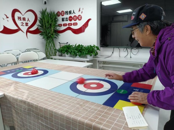 运动会现场设置了多个适配性强、互动性足的特色项目,涵盖旱地冰壶、传统投壶、沙包掷靶、蒙眼敲锣、俄罗斯方块叠叠乐等,兼顾竞技性与趣味性,满足不同残疾人朋友的参与需求。旱地冰壶赛道旁,欢呼声与讨论声此起彼伏,参与者紧盯赛道,沉稳推动壶体,在策略与技巧的碰撞中体验竞技乐趣,也在相互探讨间拉近了彼此距离;投壶区域尽显古意,参与者手持箭支,凝神静气投掷,在传统民俗与趣味游戏的融合中挑战自我,感受传统文化的独特魅力。