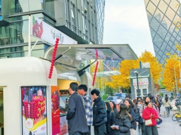 初冬的北京CBD,寒风掠过鳞次栉比的写字楼群,位于呼家楼街道的住总大厦门口却升腾着暖暖的烟火气。不久前,市民口耳相传的“国贸糖葫芦”,不仅在此拥有了合规“落脚点”,更有了正式品牌标识 ——“呼家楼冰糖葫芦”,千余名“忠实”糖葫芦爱好者不用每天在微信群里追问出摊地点了。