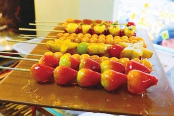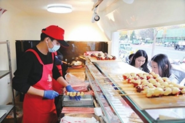 “在这地方挺好,开阔敞亮,温度也适合做糖葫芦,生意越来越好,亲戚朋友都来帮忙了。”老陈望着身后的摊位车笑着说。(朝阳报)