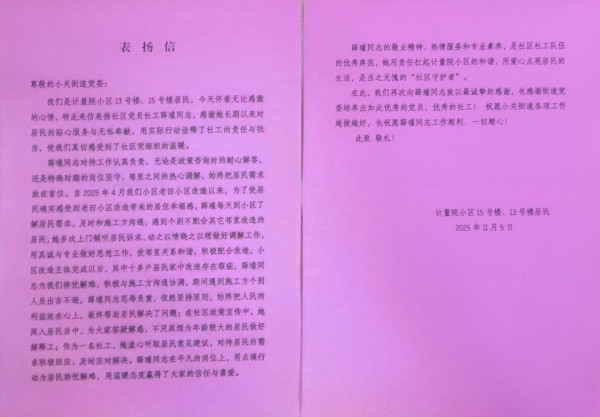 社区工作者的默默付出,居民们看在眼里、记在心里。不久前,一封饱含真情的联名表扬信被送到了惠新苑社区居委会,字里行间满是对薛瑾等工作人员“贴心服务、无私奉献”的感激之情。这封信,不仅是对社区工作的肯定,更是小关街道用服务架起“干群连心桥”的有力见证。
