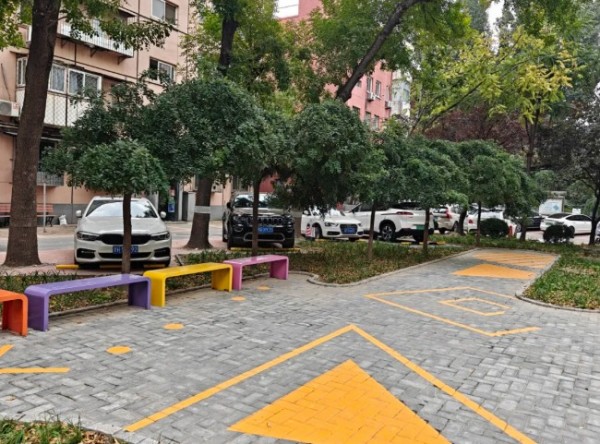曙光里34号楼前的旧车棚曾让居民怨声载道:顶棚漏雨、内部动线混乱、充电桩不足,周边绿地也因失管杂草丛生。针对这一痛点,左家庄街道推进“绿色宜居·车棚焕新”项目,实施双维度改造:一方面全面升级车棚设施,更换顶棚、优化布局、增设充电桩,提升使用安全性与便捷性;另一方面重新规划周边绿地,补种绿植覆盖裸露黄土。