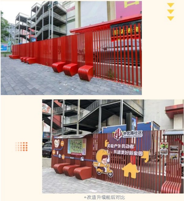 据了解,新辰里商圈作为酒仙桥核心商业区域,商户密集、订单集中,常年吸引大量骑手往返停靠。此前,许多骑手为节省配送时间,只能在商场周边临时歇脚,既影响通行秩序,也面临着饮水难、充电难、避雨难等实际问题。为精准回应群体需求,酒仙桥街道中北路社区以党建为引领,依托“电子城周边综合整治改造”项目,对商圈前沿公共空间进行精细化升级,将街角小微空间与“城市家具”有机融合,打造出这座功能完备的暖“新”驿站。驿站外墙点缀的“暖心驿站、累可歇脚、共建美好家园”等温情标语,搭配新增的避雨棚,让户外劳动者的奔波之路多了一处“风雨无忧”的停靠点。