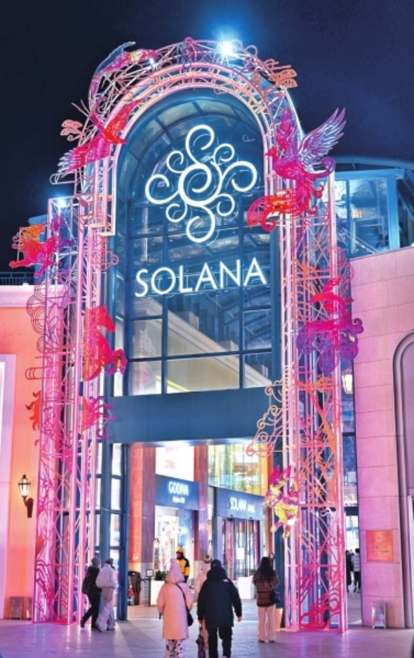 街区内部,一场绮幻的“立体非遗”之旅徐徐展开:蓝色港湾西门头上方,貔貅、天马、绶带鸟、青鸟、锦鲤、玉兔六大瑞兽齐聚,构成一幅立体的“城市护身符”。在中央广场,SOLANA MALL建筑楼梯化身为巍峨的“龙门”,巨型“锦鲤”剪纸灯光装置“逆流而上”,生动演绎“鲤鱼跃龙门”的吉祥寓意。能量广场的“貔貅镇守”、品牌街穹顶的“绶鸟翩跹”和亮马食街“万愿汇聚”光门,更是营造出“一步一景”的行进式体验感。