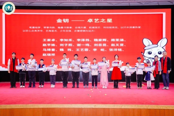 值得关注的是,活动现场揭晓了“金钥·立德之星”“金钥·健体之星”“金钥·卓艺之星”三大荣誉榜单,丁析文、郝泽希、王家卓等多名学子获此殊荣,嘉宾为榜样学子授誉,以正向激励引领成长方向。学校吉祥物“保小兔”家族——美德兔·保保、智慧兔·晓晓等五只萌兔也活力登场,其命名源自全体少先队员征集,寄托着“保品格、晓智慧、跃活力、新探索、梦未来”的成长期许,俏皮灵动的表现点燃现场氛围。