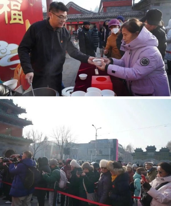 农历腊月初八,北京民俗博物馆(东岳庙)南门广场暖意融融。作为第二十五届北京民俗文化节的开篇活动,“赠粥传情迎年纳福”腊八舍粥活动如期而至,千余碗熬制数小时的香甜腊八粥免费赠予市民,在寒冬中传递着延续700余年的民俗温情与新春祝福。