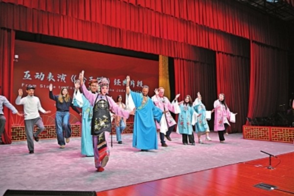 互动教学环节氛围热烈。国声京剧团的演员身着精致戏服登台,现场示范京剧《拾玉镯》经典选段,手把手指导外国友人学习台步、水袖等动作。外国友人兴致盎然,跟着演员认真模仿。剧场内掌声、欢笑声交织,成为中外文化双向奔赴的生动注脚。