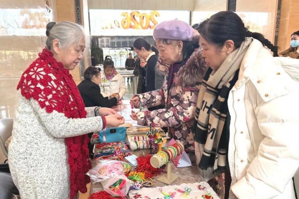绳艺手工区域同样热闹非凡。朝阳区民间文艺家协会理事李贞的工作台被群众围得水泄不通,桌上陈列的蝴蝶、蜻蜓造型绳艺作品栩栩如生,彩色红绳手链尽显新春气息。李贞老师耐心拆解编织步骤,从红绳绕折、交叉固定到拉紧塑形、打结收尾,手把手指导大家制作基础中国结,并为完成作品的群众戴上专属手链。“平时工作忙没机会做手工,今天学会了编中国结,红绳讨个好彩头,还感受到了传统手工艺的魅力!”刚戴上新手链的李女士满心欢喜地说。