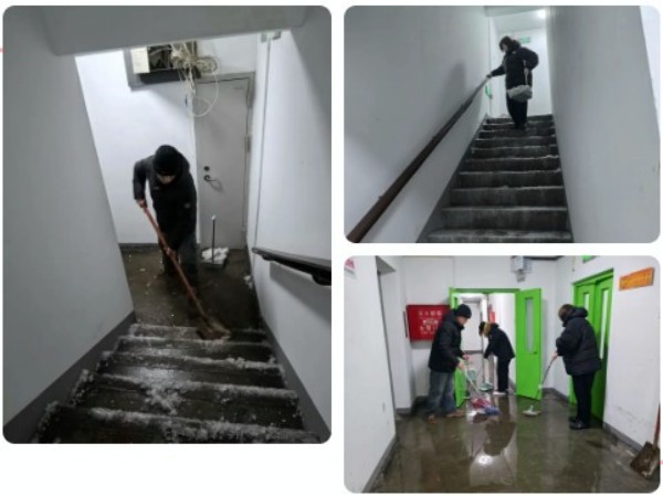 住户已自行联系热力公司完成维修及室内积水清理,但泄漏的暖气水已蔓延至5层至1层的公共走廊及步梯区域。当日室外气温低至-12℃,积水极易快速凝结成冰,给居民出行带来极大安全隐患。低温环境加剧了处置难度,冰层易反复凝结,且受影响住户分散,逐户排查沟通耗时耗力。社区工作人员迅速分工协作,一组携带扫帚、拖把、铁锹等工具,从5层至1层逐段清理积水、铲除冰层;另一组逐户走访受影响住户,排查房屋漏水及财产受损情况,记录居民需求并提供必要帮扶。仅用1小时,工作人员便完成全面清理,随后开展二次检查,确认无积水残留、无结冰隐患,切实保障了居民出行安全。