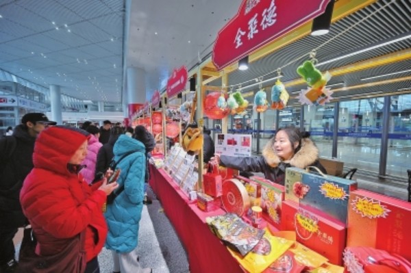 新春市集内,烟火气与文化味交织相融。全聚德的挂炉烤鸭、稻香村的点心匣子、张一元的茉莉花茶、百年义利的京味糕点、来今雨轩鲁迅的同款冬菜包子,10余家中华老字号一字排开,成为市集人气高地。旅客王先生手里拎着两盒稻香村点心匣子说道:“本来没来得及买北京特产,没想到候车时能‘一站式’购齐,带回去给家人尝尝地道京味。”