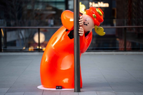 沿街而行,北区标志性建筑群间,一座座红色玻璃展柜错落排布,珍藏级非遗狮头被悉心陈列。灯光映照下,汲取京剧脸谱灵感的“粉墨登场”系列线条锐利,以荧光色点缀的“潮狮觉醒”系列潮范十足,引得路人纷纷驻足拍照,定格传统与潮流碰撞的精彩瞬间。街头趣味装置更为年味增添几分灵动:憨态可掬的橙色财神雕塑或抱柱探头,或贴窗“张望”,与展柜中的醒狮头相映成趣,成为年轻人打卡祈福的热门点位。