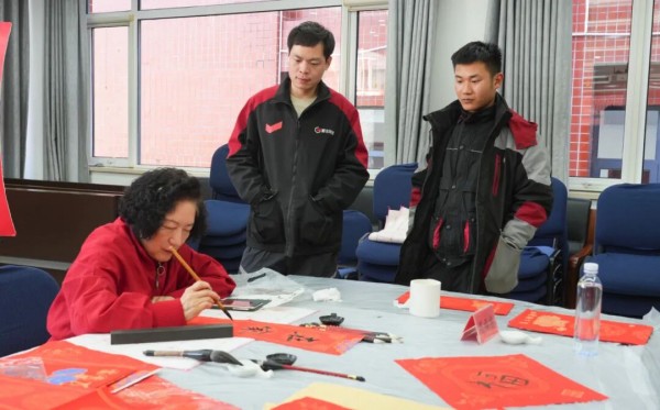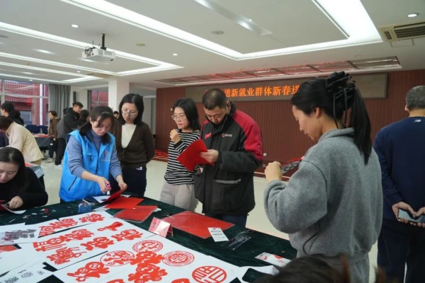 这是小关街道专门为辖区新就业群体举办的新春送福暖“新”活动现场。与往年不同,今年不只有书法家挥毫泼墨——辖区书法协会的老师们身旁,多了几位穿着各色工服的“学生”。快递员们放下配送箱,学着铺纸、运笔,有人剪出人生第一朵窗花,有人串起红彤彤的吉祥珠串。平日里争分夺秒的双手,此刻在纸香与笑谈中慢了下来。