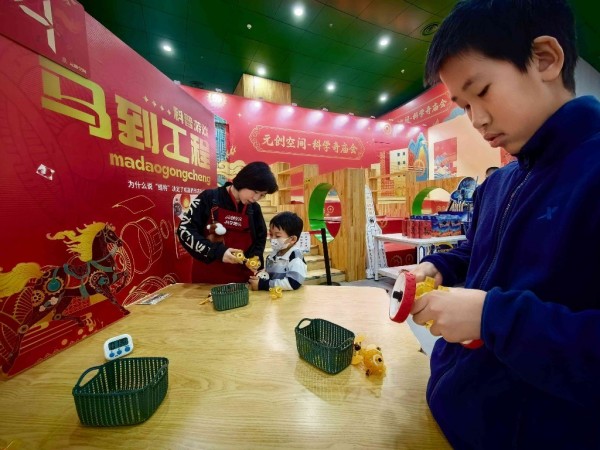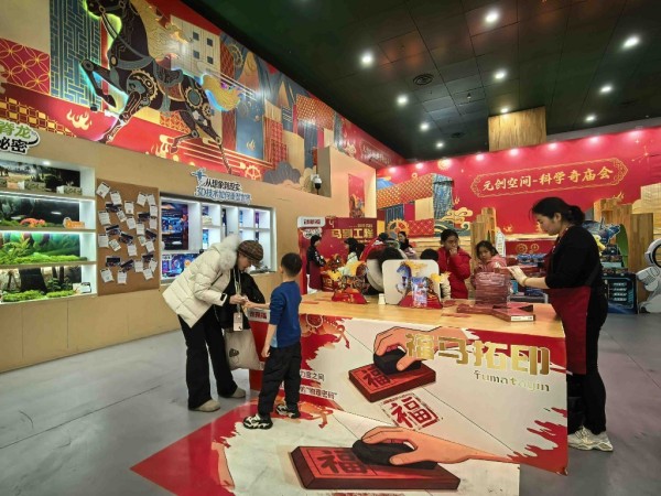 科技馆里是另一番热闹景象。中国科技馆的“科学奇庙会”互动区,孩子们挤在投壶游戏桌前,每投中一支箭,旁边的家长就欢呼一声——这里投中的不仅是箭,还有藏在壶底的物理原理。福字拓印台前排着小长队,小朋友握着拓包使劲按压,一个个“福”字跃然纸上。第十七届“科技大联欢”自2月10日启动以来,每天笑声不断,活动将持续到2月26日。