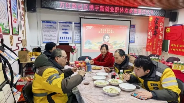 这份关爱不仅停留在物质保障上,更延伸至情感连接和治理融合中。除夕夜,在万红路社区,一场特殊的年夜饭温暖开席。未能回家团圆的骑手们从城市的“配送员”变身为幸福的“被服务者”,与社区工作人员、居民一起品尝“家”的味道。现场还通过视频连线的方式,向远方的家属送去问候。这份温暖也激发了小哥们的责任感,他们主动加入社区的巡逻队伍,参与安全巡查,并为社区里的高龄老人送去节日慰问,完成了从“送货”到“送暖”的角色转变。