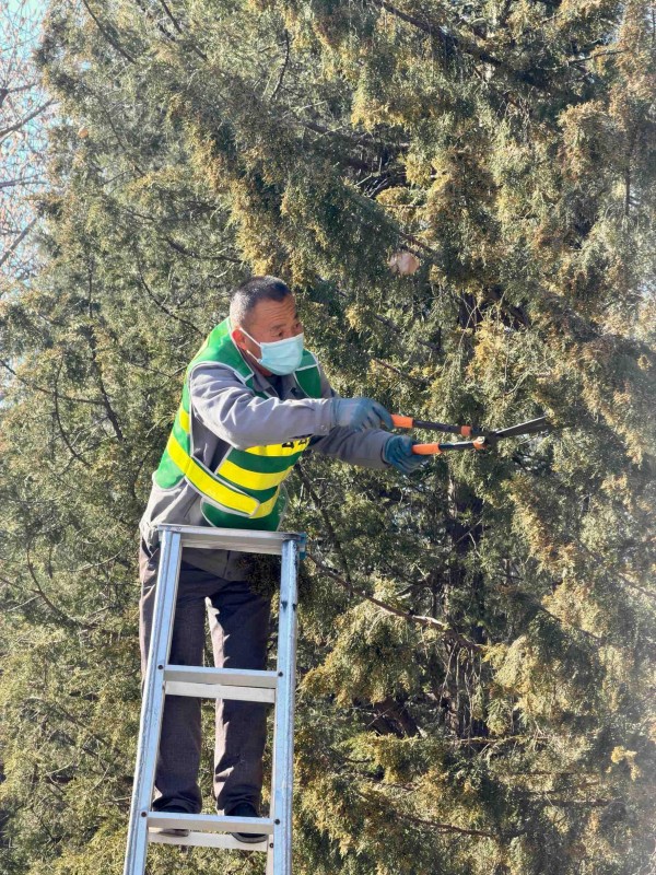作为北京冬季城市绿化的重要常绿树种,柏类植物广泛种植于公园、快速路隔离带、行道树及居民小区,为城市增添绿色生机。据统计,朝阳区城区内公园绿地圆柏雄株达2万余株,主要集中在日坛公园、团结湖公园、元大都公园、奥林匹克森林公园、朝阳公园等地,这些公园游人密集,成为此次花粉治理的核心区域。除了修剪雄株外,针对花粉易扩散的特点,往年,绿化养护部门主要采取湿化防控,在花粉高发期每日对重点区域开展喷水作业,通过树体湿化抑制花粉飘散。