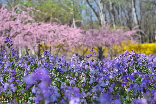 作为朝阳区郊野公园中的春日宝藏,东风公园的二月兰藏着闹市中的静谧美好。紫莹莹的花簇铺满林间空地与步道两侧,宛如给大地铺上了紫色绒毯。园内春色层次分明,紫色二月兰作底,金色连翘缀于其间,粉色梅花枝头俏立,红紫金黄相映成趣,勾勒出一幅鲜活的春日画卷。从公园主路向林间漫步,步步皆景,野花肆意生长,鸟鸣声声入耳,野趣十足的自然之美让人心旷神怡。公园内朝阳绿道蜿蜒穿梭于花海间,骑行其中,花香拂面,满目春色,成为不少骑友的春日优选。