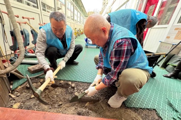 这份守护并未止步于校门。志愿服务还延伸至校园之内,社区党员志愿者们主动走进幼儿园,开展了一场贴心的“校园焕新”行动。他们携带工具,仔细检查并修复了园内路面的裂缝与坑洼,清理了碎石杂物,用实实在在的劳动为幼儿们的活动安全加固了“环境防线”。