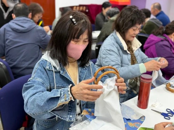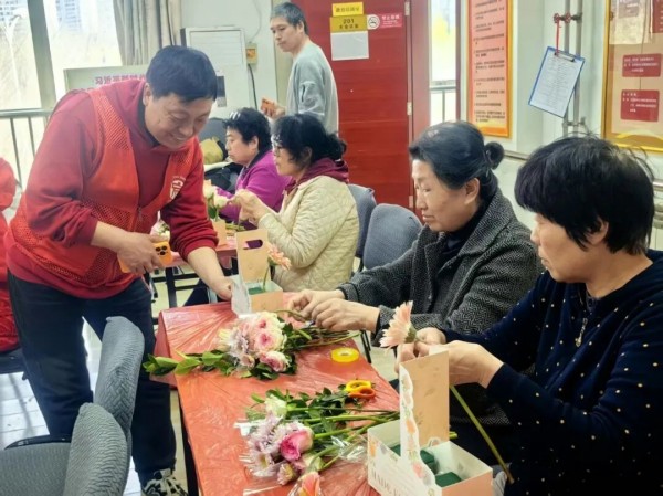 与此同时,温馨的手作时光也在多个社区同步上演。芍药居三社区的孩子们用灵巧的小手制作出叮咚作响的春日风铃,串起了满院的欢声笑语。芍药居五社区的老年朋友们则在一针一线中专注地制作竹节包,体验着手工艺的乐趣与邻里陪伴的温暖。在十字口社区,居民们在花香四溢中学习插花艺术,用玫瑰、康乃馨等花材创作出独具匠心的作品,品味生活中的“慢时光”。