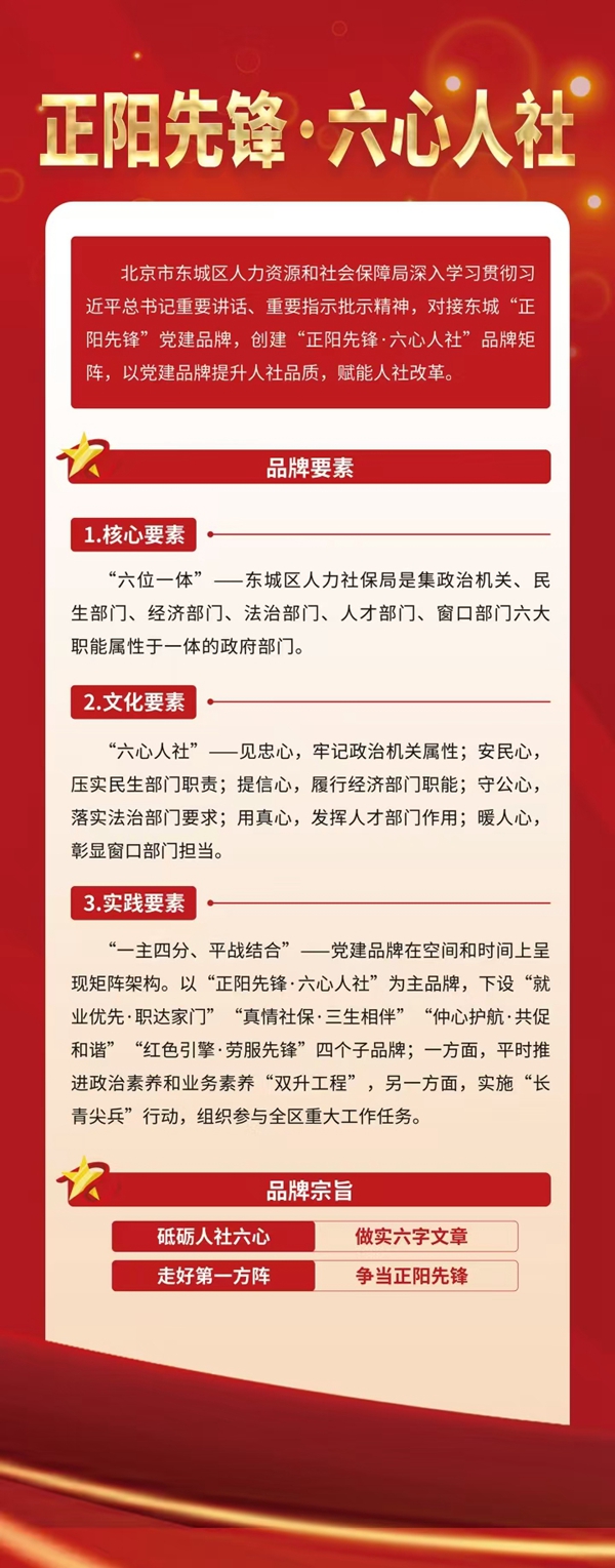 北京市东城区人力资源和社会保障局主要担负辖区稳定促进就业、社会保险经办、维护和谐劳动关系、人事人才管理服务等四大方面职责,是东城区重要的民生保障部门。近年来,东城区人社局持续深化“崇文争先”,坚持“以文育人”“以文化人”,把精神文明建设融入服务品牌创建工作,精答三道加法题,建立起“正阳先锋·六心人社”品牌矩阵。