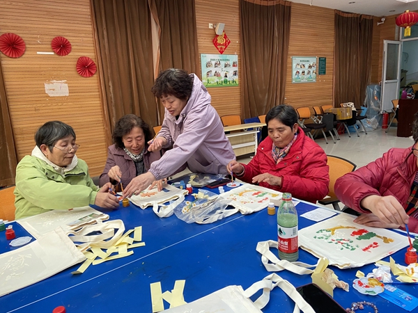 此外,社区还组织老人们制作重阳节手绘拓印布包。社区居民们在老师的指导下,亲手制作富有民俗韵味的布包,在实践中感受传统文化的魅力。制作过程中,邻里之间交流心得、互帮互助,不仅增进了情感联系,也缓解了独居老人的孤独感。
