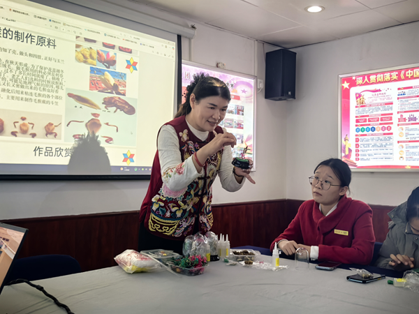非遗传承人许素敏以“毛猴的前世今生”为主题,通过图文结合、实物展示的方式,生动讲述毛猴制作的起源传说、历史发展与文化内涵。从明清时期民间艺人的即兴创作,到如今成为非遗项目的传承与创新,团员青年深入了解到毛猴不仅是手工艺作品,更是承载着民俗风情与生活智慧的文化符号。同时,传承人展示了《西游记》经典形象、老北京民俗场景等传统毛猴作品,以及融入现代元素的创意作品,以此激发青年群体的创作热情与灵感。