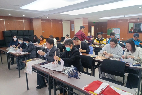 接下来,手工制作减压锤的环节更是让大家兴致盎然,在讲师的指导下,参与者们挑选心仪的花纹布料,亲手裁剪、填充、缠绕绳线,一个个色彩斑斓、图案精美的减压小锤逐渐成型。大家拿着自己制作的小锤轻轻敲击肩颈,欢声笑语间感受到压力的释放。