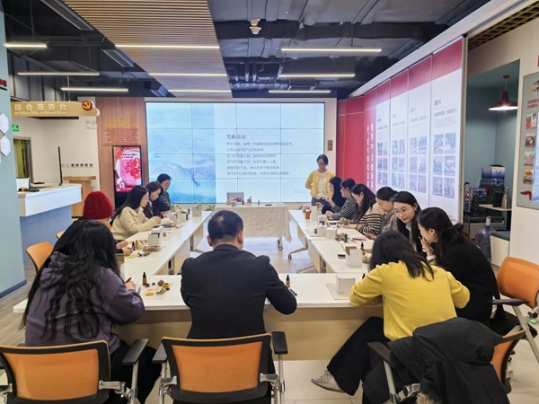 在芳香疗愈环节,活动现场备齐多种香型的精油,大家在专业引导下,通过掌心搓热精油、深浅呼吸嗅闻的方式,将嗅觉感知的气息转化为具象化“颜色”,并以画笔绘出专属“香气地图”,在沉浸式体验中舒缓了工作焦虑与生活压力。香薰制作环节更是趣味十足,老师详细介绍了无火香薰的制作原理、干花搭配技巧、精油剂量控制方法等要点。大家或固定干花雕琢造型,或搭配肉桂棒与棉花营造层次,在交流分享创作心得的温馨氛围中,一个个香气怡人、造型别致的无火香薰作品相继完成,活动现场花香四溢、笑语交织。