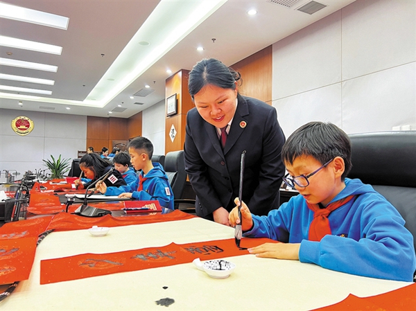 近年来,东城区检察院始终以文化建设为抓手,深度融入区域文脉,将检察精神转化为司法实践效能,在未成年人保护、民生司法保障、科技赋能检察等领域亮点纷呈。这一理念在1月15日至16日开展的“法润童心 共迎新春”检察开放日活动中得到生动延续。来自史家胡同小学的师生们走进正阳未检青少年法治教育基地,先后参观警务工作区、体验心理沙盘游戏、参与“穿越中轴”法治研学,真切感受到“法律就在身边”。模拟法庭上,同学们化身“一日法律人”,在法槌起落间体悟司法庄严与正义分量;卷宗装订实践中,在一丝不苟的操作里感受检察工作的严谨细致;猜法治灯谜、写法治春联环节,更让墨香四溢的传统年味与润物无声的法治理念完美交融,为青少年带来沉浸式法治启蒙。“这场普法活动不仅让我学到了法律知识,更懂得了法治社会里惩戒与教育的深意。未来,我会带着这份认知,做知法、懂法、守法且心怀善意的人。”史家胡同小学六年级五班学生徐阳的感言,道出了活动的普法实效。