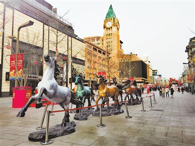 2026年是农历丙午马年,活动特邀中国工艺美术大师朱炳仁匠心创作,在街区内打造“王府八骏”艺术雕塑群,八匹骏马姿态各异,或昂首奔腾尽显昂扬锐气,或从容驻足流露沉稳气度,铜色流光与夜间灯光交相辉映,在金街街头形成一幅立体鲜活的“奔马图”,既与“万马奔腾”活动主题深度呼应,更寄托着奋进不息、前程万里的新年愿景,为金街增添了浓厚的文化底蕴。