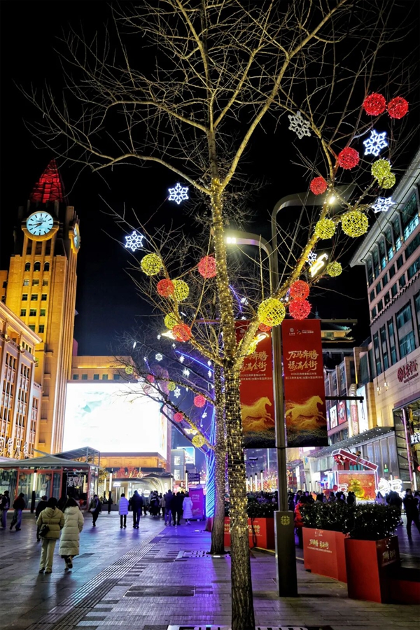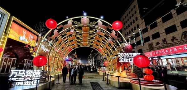 夜幕下的王府井大街化身璀璨星河,暖金色的光影将浓郁的新春氛围悄然铺满。