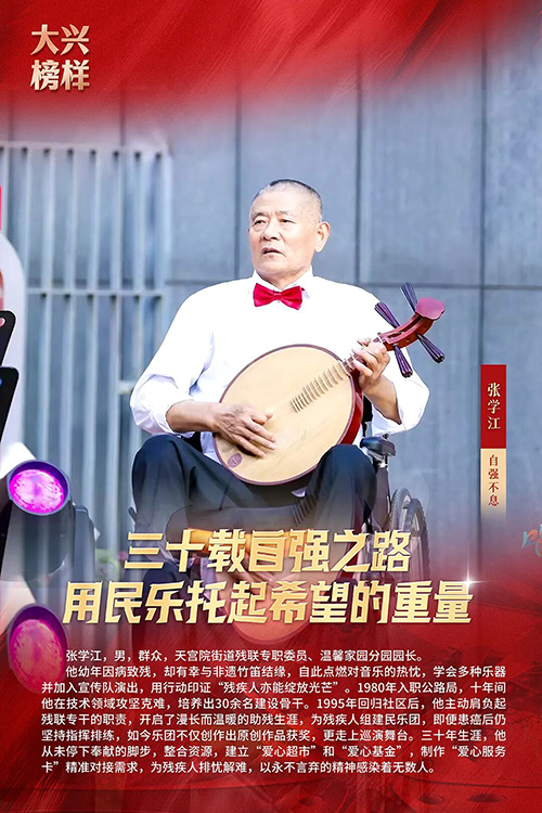 张学江,男,群众,天宫院街道残联专职委员、温馨家园分园园长。他幼年因病致残,却有幸与非遗竹笛结缘,自此点燃对音乐的热忱,学会多种乐器并加入宣传队演出,用行动印证“残疾人亦能绽放光芒”。1980年入职公路局,十年间他在技术领域攻坚克难,培养出30余名建设骨干。1995年回归社区后,他主动肩负起残联专干的职责,开启了漫长而温暖的助残生涯,为残疾人组建民乐团,即便患癌后仍坚持指挥排练,如今乐团不仅创作出原创作品获奖,更走上巡演舞台。三十年生涯,他从未停下奉献的脚步,整合资源,建立“爱心超市”和“爱心基金”,制作“爱心服务卡”精准对接需求,为残疾人排忧解难,以永不言弃的精神感染着无数人。