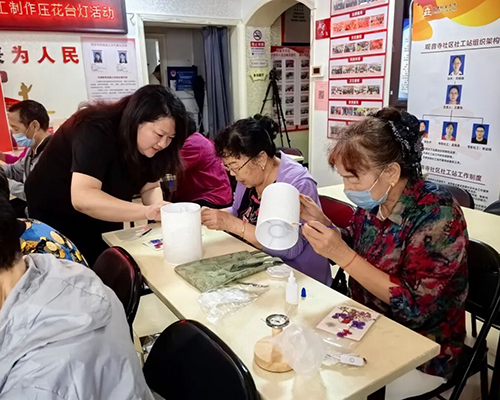 活动特别邀请了经验丰富的手工艺术讲师现场指导。从花草选材、构图设计到粘贴制作,讲师都进行了耐心细致的讲解。居民们兴致盎然,自由挑选心仪的干花,在台灯灯罩上精心布局,将大自然的美丽定格成永恒的光影。当一盏盏独一无二的压花台灯点亮时,现场洋溢着满满的成就感与幸福感。