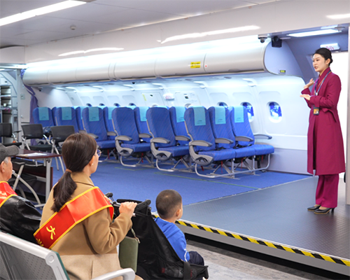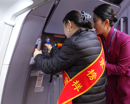 在客舱模拟舱,榜样们在专业指导下沉浸式感受航空服务的规范流程与细节魅力。作为航空科普与职业体验的重要载体,南航客舱模拟舱让体验者告别“远观”,亲手解锁航空服务的关键操作。在开关门体验环节,每一个发力点、每一次锁扣到位的反馈都与真实航班一致,大家通过亲手操作,直观感受航空安全操作的严谨性。语音播报体验则让参与者全方位沉浸在飞行情境中,“北京榜样”周彤尝试播报简易内容,在角色代入中感受航空服务特有的语言规范与专业沟通技巧。“这次亲手操作舱门、聆听完整的语音播报流程,才发现航空服务的每一个细节都经过了千锤百炼,让我对南航的安全标准和服务规范有了全新认知。”“北京榜样”于丽萍说道。
