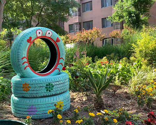 废旧轮胎经过彩绘改造,变身为海绵宝宝、哆啦A梦等卡通形象,错落分布在花园与步道旁,萌趣十足,成为兼具观赏性与趣味性的社区景观。这些彩绘成为了连接邻里、传递文明的纽带,让公共空间真正属于每一个人。
