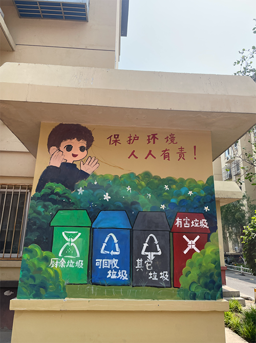 在华远和煦里社区,通风井外围的墙面上,绘制出一幅幅巨大的“文明画卷”。清新的绿植、活泼的卡通形象、醒目的环保标语……每一笔色彩都充满巧思。墙体上“绿树成荫、鲜花绽放”,与周围的环境和谐相融,使文明成为看得见的色彩。