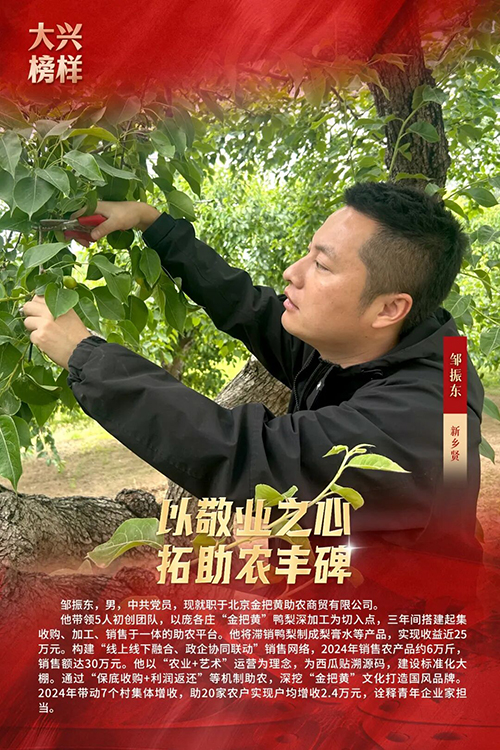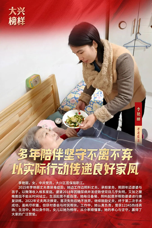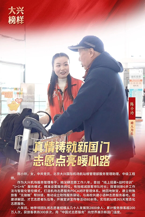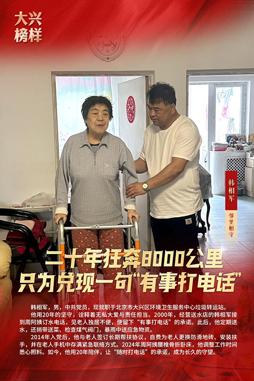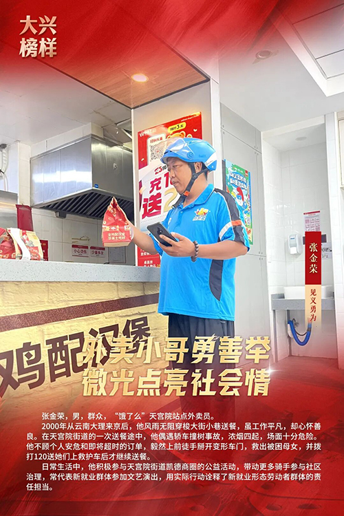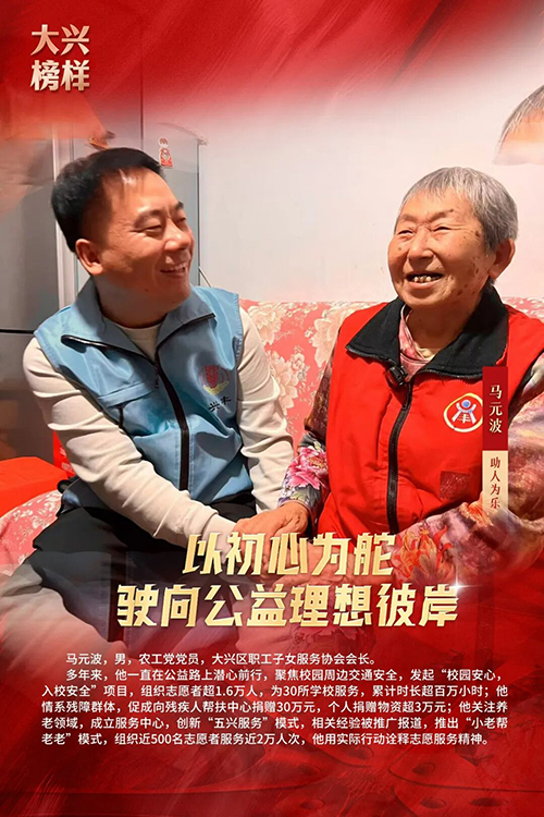 为充分发挥先进典型示范引领作用,引领向上向善社会好风气,2025年3月,大兴区委宣传部、大兴区文明办开展寻找“大兴榜样”主题活动,共选树助人为乐、敬业奉献、见义勇为、孝老爱亲、自强不息、邻里相守、乡村振兴、好少年8类“大兴榜样”月榜人物166人。2026年1月30日,大兴区委宣传部、大兴区文明办举办“文明花开新国门 奋楫扬帆启新程”主题宣传活动,发布2025年度“大兴榜样”年榜名单,马元波、陈小玲、周堃、张影、张汝栋、张金荣、李艳丽、周彤、韩相军、邹振东、黄姿晓11人,入选2025年度“大兴榜样”年榜。他们用一言一行践行初心、传递温暖,生动诠释了崇德向善、实干担当、友爱互助的社会好风气。