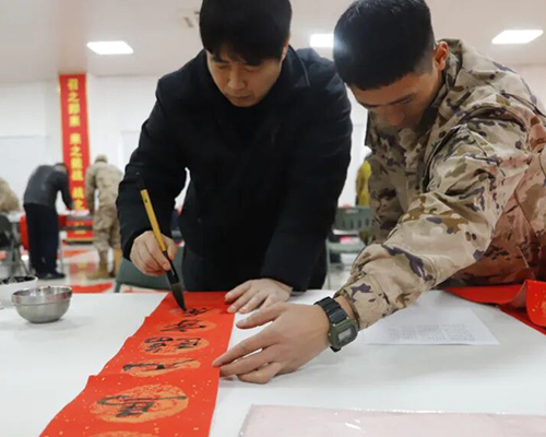 兴丰街道退役军人服务站邀请书法名家走进驻区部队,开展“万福迎春暖军营 翰墨双拥贺新春”主题活动。现场墨香萦绕,官兵们热情协助铺纸研墨,书法家们凝神聚气、挥毫泼墨,一副副充满祝福的春联和“福”字呈现眼前。活动共创作300余张“福”字与200余副春联,将对人民子弟兵的真挚敬意与新春美好祝愿深深融入笔墨。此次活动不仅丰富了官兵文化生活,营造出浓厚的过年氛围,更让战士们感受到家一般的温暖,生动诠释了“军爱民、民拥军”的鱼水深情。