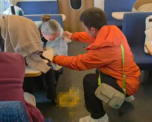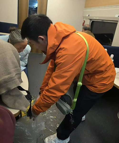 此时,列车乘务员也闻讯赶到。吴家伟与乘务员一同将老人小心搀扶到餐车休息。并从自己的背包中取出随身携带的糖果和矿泉水,帮助老人缓解症状。