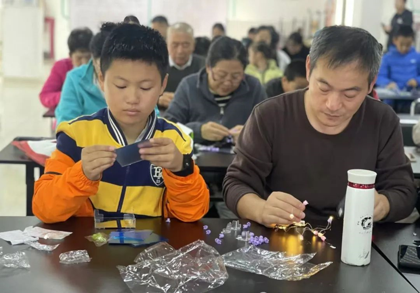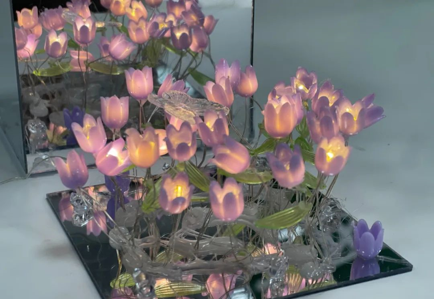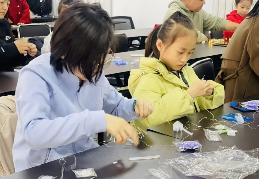 随着小灯泡的点亮,这些手工郁金香在镜面的反射下,形成一片璀璨的花海。活动现场充满了欢声笑语,孩子们在手工制作中体验到了乐趣,也在互动交流中增进了友谊。