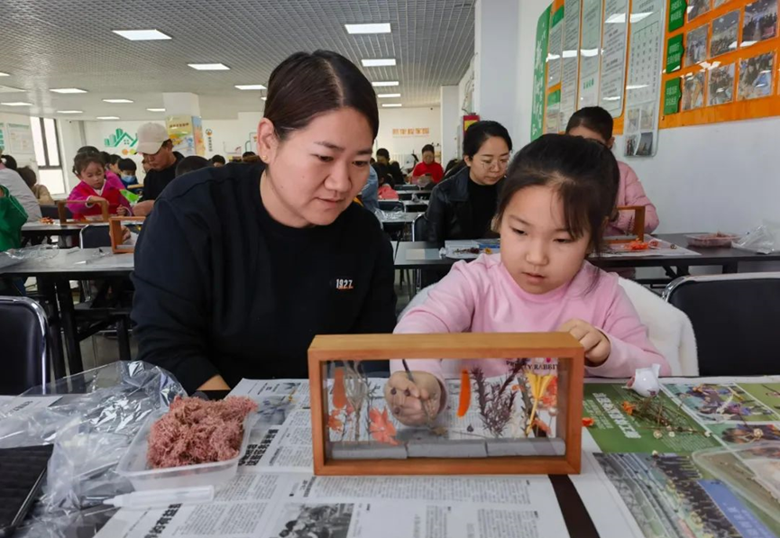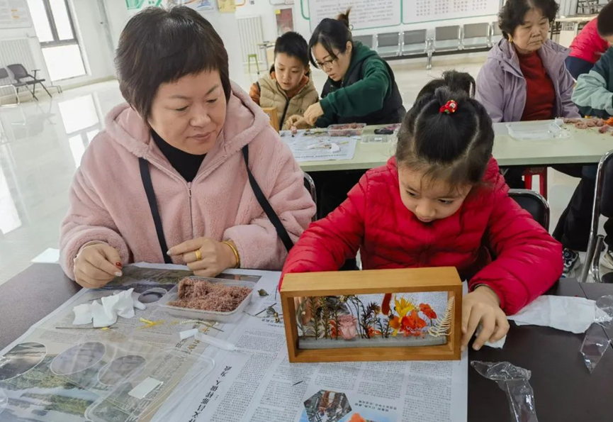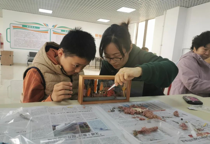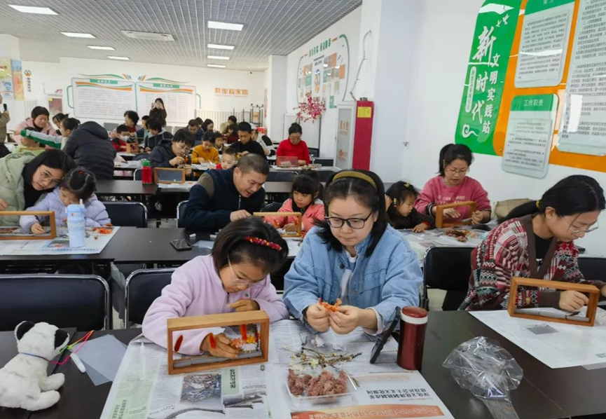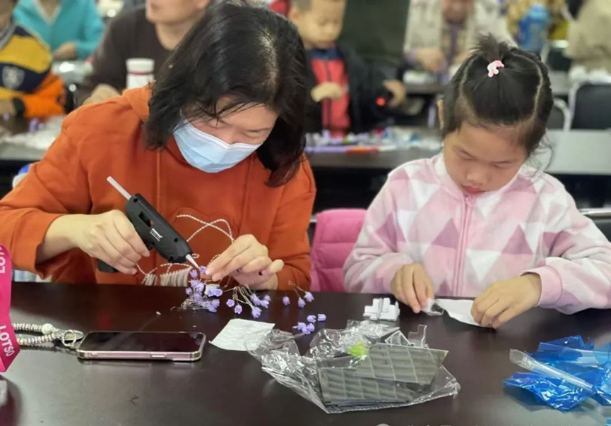 在长阳镇新里程家园社区新时代文明实践站,干花相框亲子手工制作活动正在火热开展,亲子互动课堂上,家长陪伴孩子用灵巧的双手为生活“调味”。