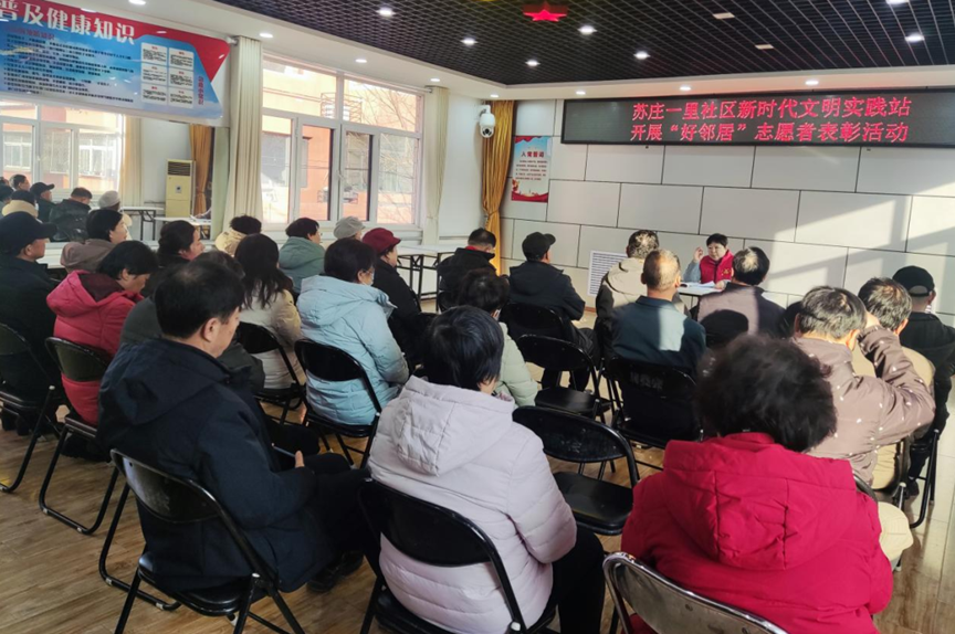 12月24日,创城专班联合启航社会治理研究中心在北潞园片区开展“好邻居”最美社区服务者评选表彰活动,评选出一批在社区创城、志愿服务等工作中表现突出的社区居民、党员、楼门长等优秀代表予以奖励。12月25日,苏庄一里社区新时代文明实践站举办“好邻居”志愿者表彰活动,对社区志愿者们无私奉献的精神给予肯定和鼓励。